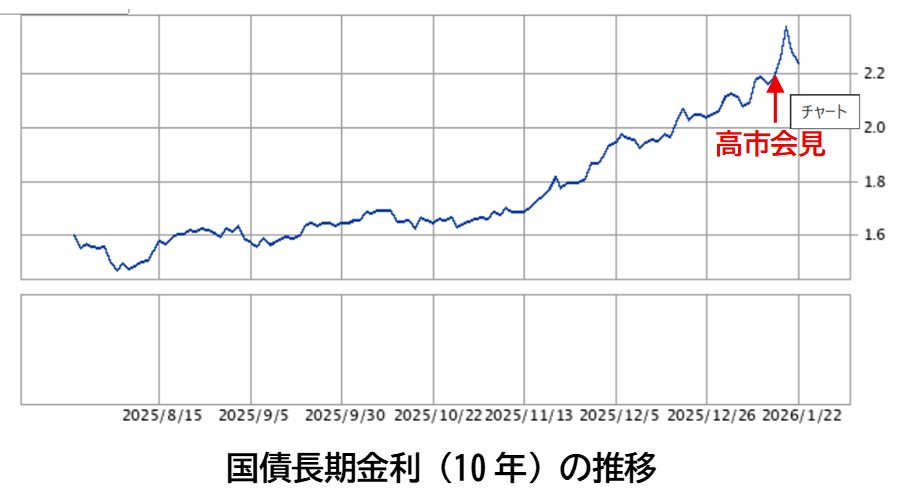 実際、長期金利のグラフを確認すると(↓)、高市会見(1月19日)の直後に金利が少々上昇しましたが、その後下落し、(植田利上げ後に実現している)「金利上昇トレンド」の範囲に収まっていることが分かります。