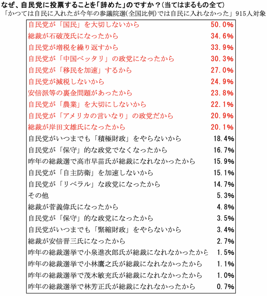 本調査結果は、自民党の衆参両院選挙での大敗は「自民党が国民を大切にしない」という認識が自民支持者の間に幅広く共有されたことが原因であることを明確に示している(分析2より。回答者の50%以上が自民を離れる原因としてそれを選択)。