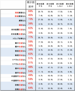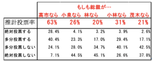 したがって、両氏が総裁になっても「離れた自民支持者の大半が再び自民支持に戻ることはない」と予期される。そして実際、小泉・林氏が総裁になった場合、今自民党から離れている人の内、次の国政選挙で自民に投票すると回答したのは僅か五分の一(林氏)から四分の一(小泉氏)しかいないという結果となった。