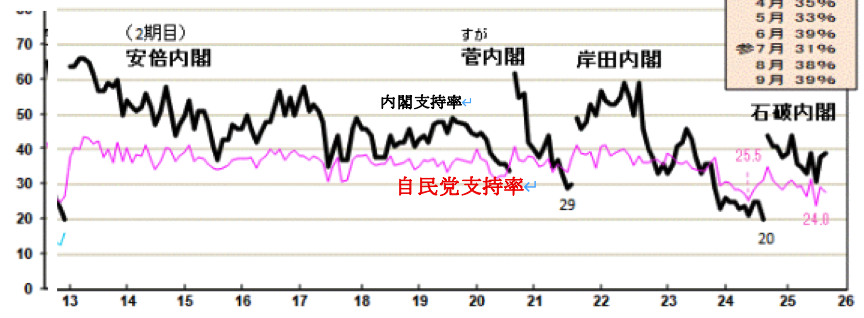 多くの自民党員はもちろんのこと、全国国民もまた、この石破総裁誕生を促した岸田氏を中心とした「党利党略・私利私欲」丸出しの自民国会議員団の振る舞いを民意に対する「裏切り」と捉えました。結果、岸田内閣下で、それまで40%前後を推移していた自民党の支持率が、30%を割り込むまでに下落しました。